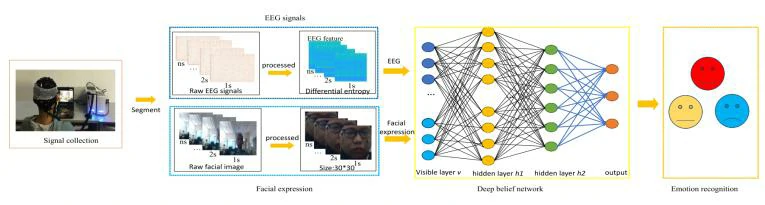 论文提出了一种基于深度信念网络(DBN)的方法,将脑电信号和面部表情的特征进行融合,用于聋人的情感分类。首先,收集了15名聋人在观看不同情感影片时的脑电信号和面部表情图像。接着对脑电信号进行预处理,提取了不同频段的差分熵(DE)特征,得到了310维的特征向量。同时,从面部视频中提取第一帧图像,并选择部分面部表情,将图像调整为30*30的灰度图像。然后将脑电信号和面部表情特征融合为一个特征向量,作为DBN的输入。最后使用DBN进行情感分类。