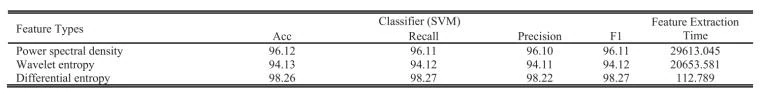文章比较了EEG三种常用特征(功率谱、小波熵和差分熵)在聋人情感识别中的性能。使用了四个指标(准确度、宏平均召回率、宏平均精确度和F1)来评估这三种特征的分类性能。此外,还考虑了时间复杂度。如表1所示,结果显示差分熵特征在情感分类中表现出色。并且差分熵所需的时间明显少于其他两种特征。因此,之后的整个实验中采用了差分熵特征。