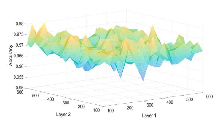 为了获得DBN中两个隐藏层的良好预训练参数数量,本文进行了比较实验。第一个隐藏层的神经元数量从100到500选择,第二层的神经元数量也从100到500选择,两层的步长为25。不同神经元数量的DBN性能如图3所示。从结果可以看出,当第一层的神经元数量约为100,第二层的神经元数量约为300时,DBN表现出色。