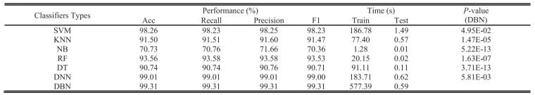 不同分类器的平均准确性、召回率、精确度、F1值和时间成本以及与DBN的p值如表2所示。实验结果表明,DBN在准确性、召回率、精确度和F1值方面均优于SVM、KNN、NB、RF、DT和DNN,其准确性约为99.31%。此外,还考虑了计算时间,结果显示所提出的DBN需要较长的训练时间(577.39秒),但DBN的测试时间(0.59秒)低于SVM(1.49秒)和DNN(0.62秒)。