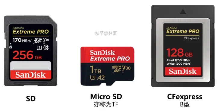 市面上目前有三种主流的存储卡:SD卡、Micro SD卡(又叫TF卡)和CFexpress卡,他们长这样: