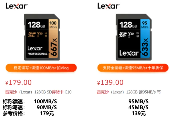以雷克沙的两款存储卡为例,金卡卡面写着读速100MB/S(卡面右上角),蓝卡卡面写着读速95MB/S,差距似乎并不大,你可能心想“傻子才会为了5MB/S多花40块”然后果断入手看上去性价比更高的蓝卡。但实际上,如果我们去查询这两款卡的写速,会发现蓝卡的写速只有金卡的一半,为了40块会付出不少代价。