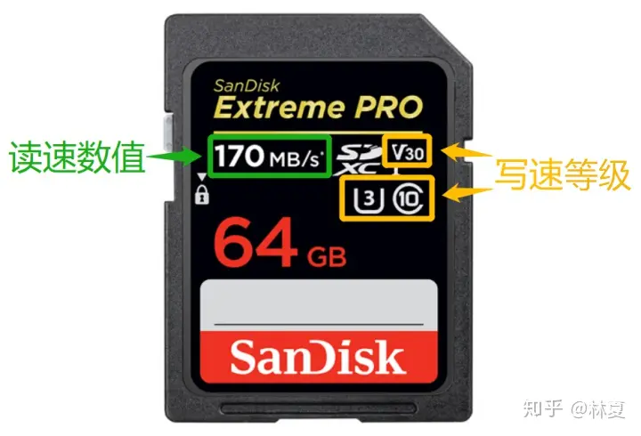 读速很简单!由于读速通常比写速高,所以读速经常会被明明白白地写在卡面上用作宣传(上图的绿色框)。例如上图这张卡的读速最高可以达到170MB/S。不过注意卡面上写的读速都是理想条件下的瞬时最高值,不保证你在实际使用中能达到或长时间保持这个速度……