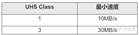 黄框第二行第一个标志叫“U3”,这是UHS速度等级(UHS Speed Class),只有U1和U3两种级别,对应的速度如下表所示。这张卡标有U3,说明它的写速至少在30MB/S以上;如果一张卡标的是U1,那它的写速应该在10-30MB/S之间。如果一张卡上根本没有U标,那它恐怕写速极慢且没有UHS技术。