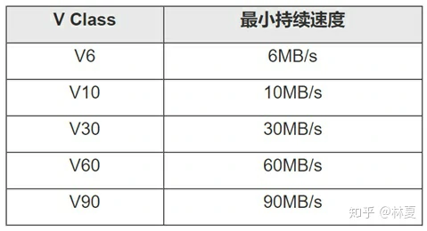 黄框第一行的标志叫“V30”,是UHS视频速度等级(V Class),专为视频拍摄所设,有V6、V10、V30、V60、V90五个级别,对应的速度如下表所示。这个等级的设立时间较晚,要求较高(重视持续写入速度),而且需要有一个认证的流程,所以不是所有存储卡都会有这个标记。如果你专注于视频拍摄,那V标比U标和C标都更有重要。