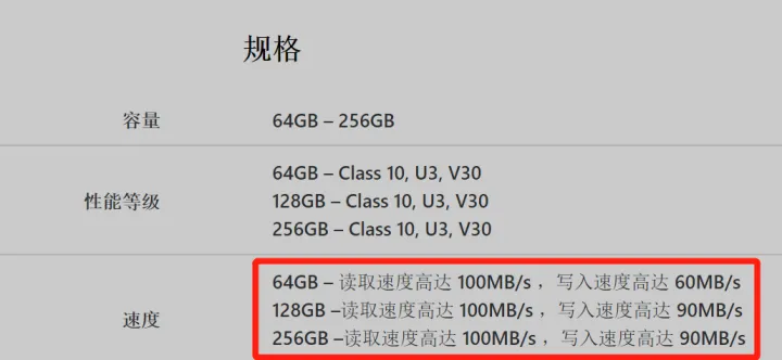 如果特别想要知道存储卡的具体写速数值?那可以去看看商品详情或去官方的参数一栏找找看。高写速是存储卡的一大卖点,所以如果一个卡的写速高,肯定会在商品详情中里重点提到。反之,如果你在商品详情和官网怎么也找不到写速,那这个卡的写速一定惨不忍睹……