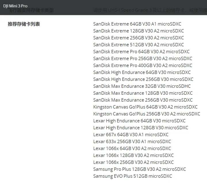 - 部分相机品牌(比如大疆)还会在官网公布《推荐存储卡列表》。这种情况可优先考虑列表中产品。