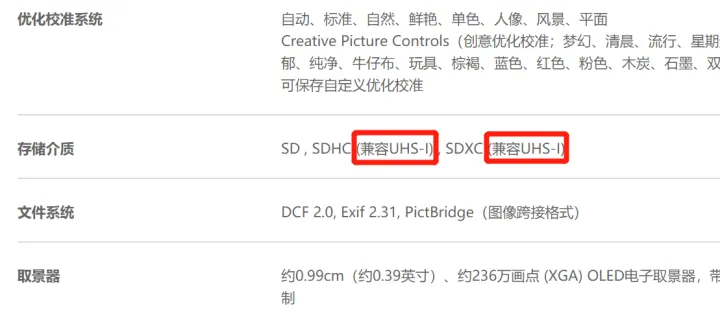例如下图中的“兼容UHS-I”表明这台相机只支持一代SD卡,并不能发挥二代卡的优势。