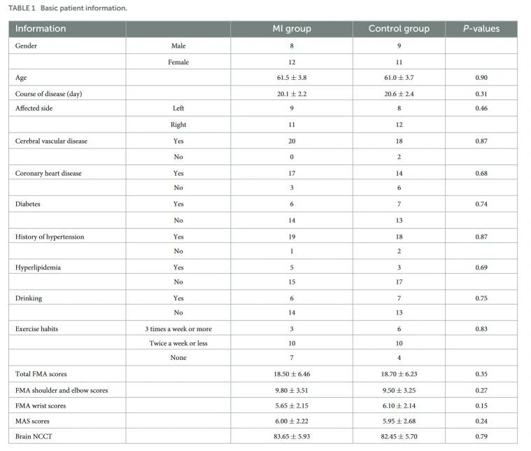 MI组接受了MI-BCI康复训练和常规康复训练。在MI-BCI康复训练期间,患者坐在舒适的椅子上,观看上肢日常动作的动画。这些动画包括抓握、放置、举起、放下、旋转等动作。脑电信号采集系统识别患者的信号,然后将其转换为运动命令,控制肌电刺激系统刺激患者的肢体肌肉。专业的康复理疗师协助患者完成动作,并确保患者避免非主观性的动作,如瘙痒、咳嗽、打哈欠和眨眼等。患者每天接受45-60分钟的治疗,每周5天,为期3周。除了MI-BCI康复训练外,MI组还接受了常规康复训练,包括平衡训练、站立训练、行走训练和日常生活能力训练。理疗师根据患者的情况调整康复计划,并评估训练效果。对照组只接受常规康复训练,其训练时间、频率和内容与MI组相同。