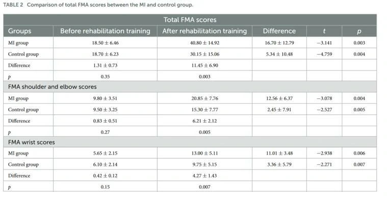 如表2所示比较了康复训练前后运动想象(MI)组和对照组的总Fugl-Meyer评定(FMA)得分。表格列出了康复训练前后MI组和对照组的平均FMA得分,以及差异和统计显著性(t值和p值)。结果表明,在康复训练后,两组患者的总FMA得分均显著提高,差异具有统计学意义(p < 0.05)。