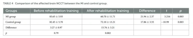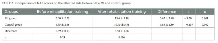 如表3所示比较了康复训练前后运动想象(MI)组和对照组受影响侧的运动评定量表(MAS)得分。表格列出了康复训练前后MI组和对照组的平均MAS得分,以及差异和统计显著性(t值和p值)。结果表明,在康复训练后,两组患者的MAS得分均高于治疗前,差异具有统计学意义(p < 0.05)。