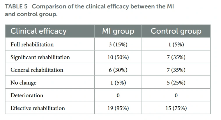 如表5所示,完全康复、显著康复和一般康复均可视为有效康复;没有变化或恶化可视为无效康复。心肌梗死组总有效率为95%(19/20),高于对照组(75%,15/20)。