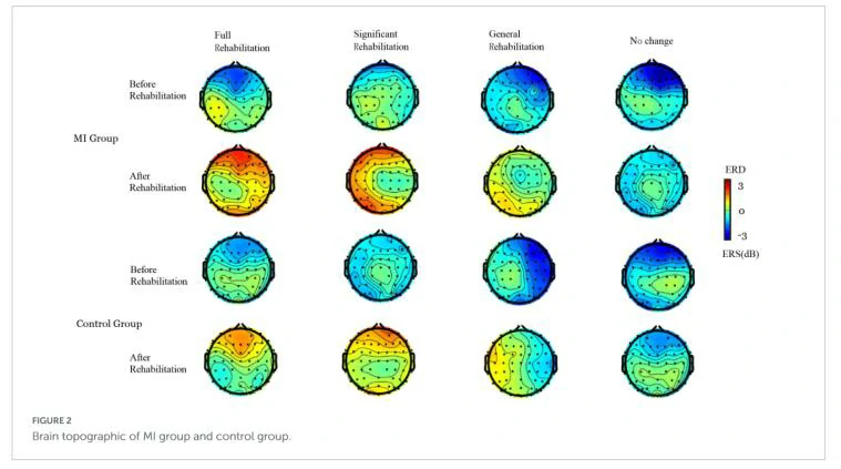在研究中,通过对触觉刺激反馈下的EEG信号的空间频谱特征进行分析,计算了每个通道的平均功率谱密度(PSD),并将PSD值映射到地形图上,以确定脑振荡的空间频谱特征,研究提取了所有受试者在典型频率范围(8-30 Hz,alpha:8-13 Hz,beta:14-29 Hz)的事件相关谱扰动功率,并绘制了脑部地形图。如图2研究结果显示,在进行了3周的MI-BCI、EMG刺激和反馈的康复训练后,与被动常规康复相比,患者在8-30 Hz的频段(alpha波和beta波)上表现出显著更高的事件相关去同步(ERD),表明大脑积极参与了身体活动。此外,研究还发现,在运动想象期间,双肢的PSD地形图相似,双侧感觉皮层区域被激活。对比康复前后两组的脑部地形图,完全康复患者对MI-BCI刺激的反应最强,显著康复患者次之,一般康复患者没有明显反应,无变化患者则没有反应。研究结果表明,积极参与的MI-BCI和FES上肢康复系统能够有效地调动患者的多传感器参与康复治疗,其康复效果显著优于被动常规治疗。然而,并非所有患者都对MI-BCI康复系统产生治疗效果,这可能与脑卒中患者大脑特殊情况、注意力集中程度以及运动功能障碍等因素有关。