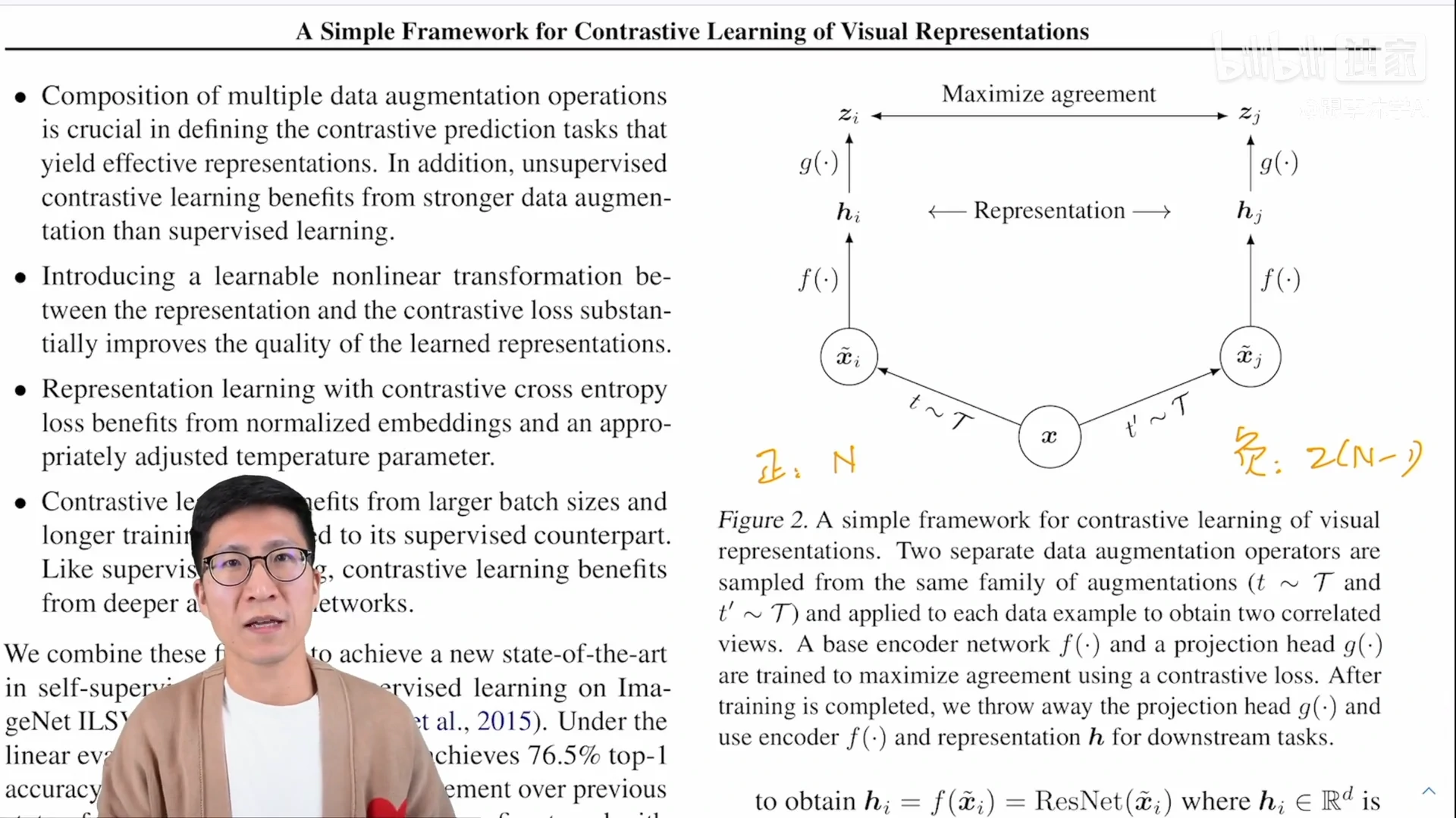 - 图二里说,如果有一个 mini-batch 的图片,假如说是 x,对这个 mini-batch 里的所有图片做不同的数据增强就会得到 xi 和 xj,同一个图片延伸得到的两个图片就是正样本,也就是说如果 batch size 是 n 的话,正样本个数就是 n,负样本的个数就是这个 batch size 剩下所有的样本以及它们数据增强过后的样本,也就和 invariant spread 里讲的一样,是两倍的 n 减 1