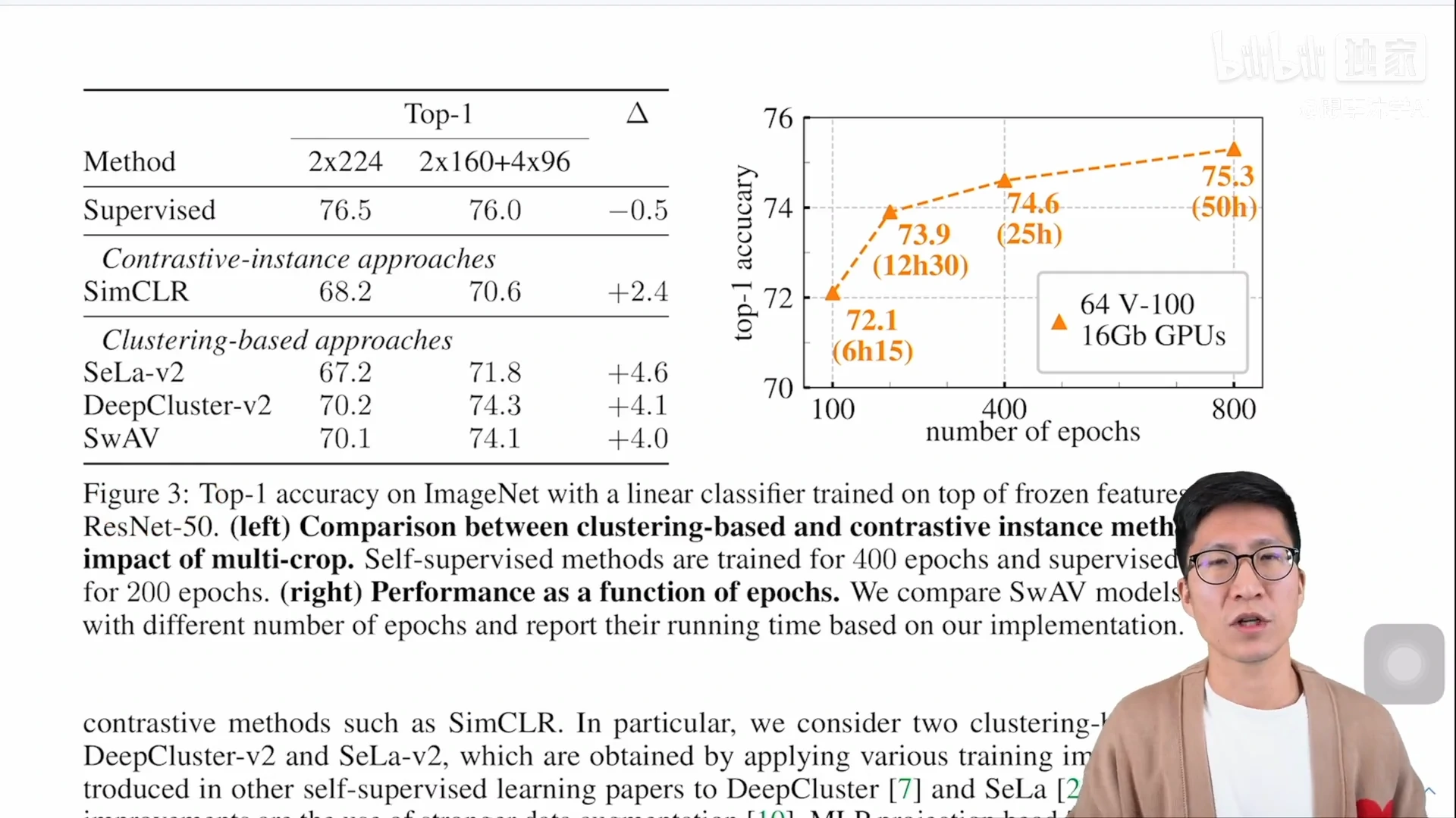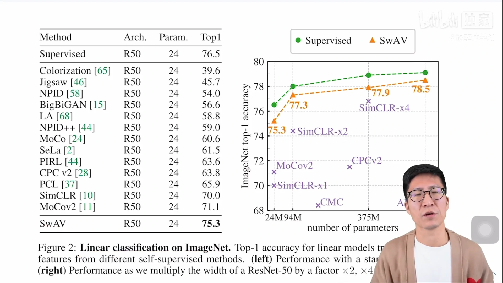 - 所以说 75.3 就算是最高的了,而且这个 75.3 是你把 backbone 冻住的情况下去做的,如果跟有监督的基线模型去比的话,这个有监督的基线模型是从头到尾都在 ImageNet 上训练,最后的结果也就是 76.5,所以说 SwAV 已经是非常非常逼近这个结果
