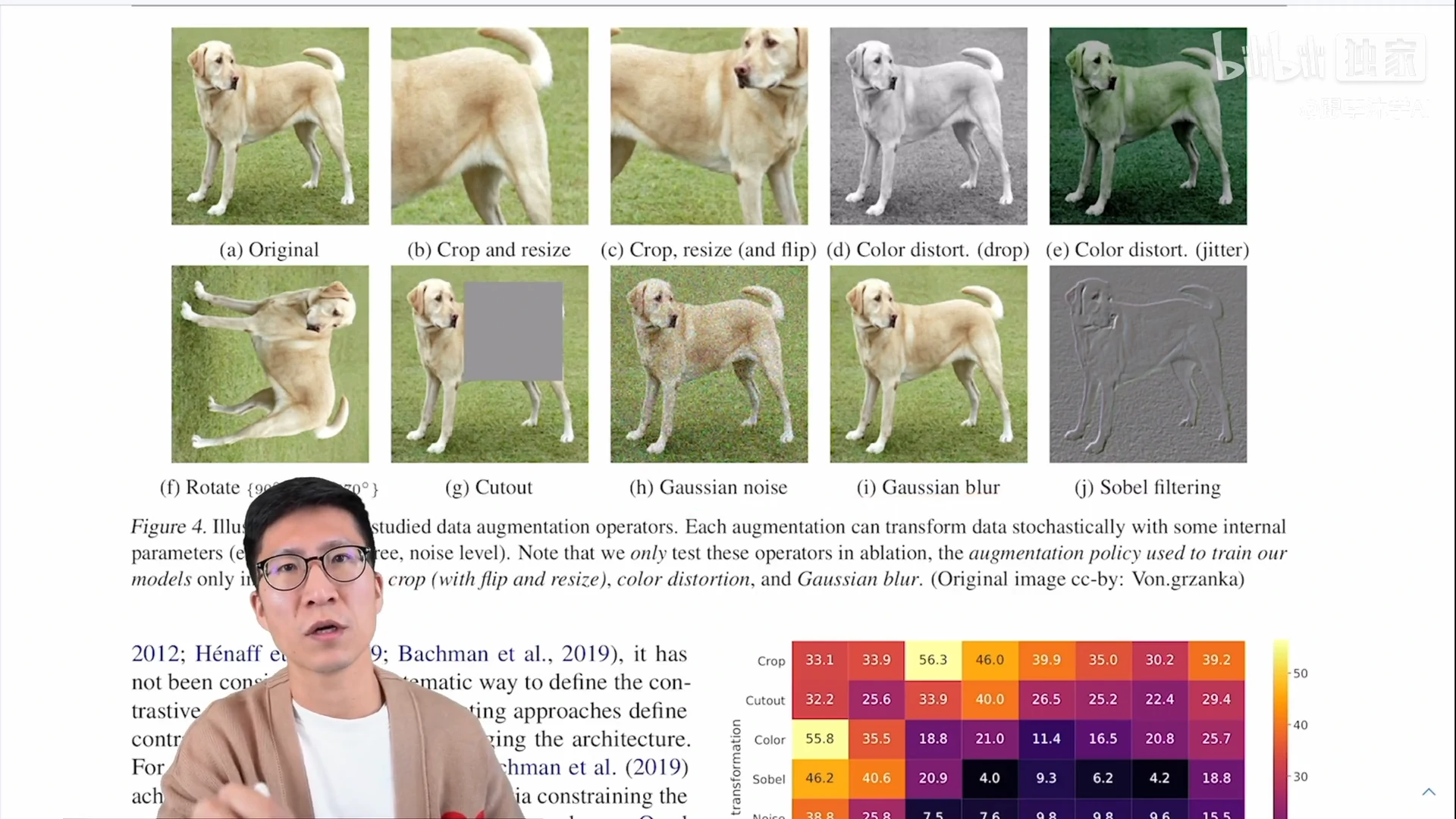 - 如下图图4所示,SimCLR 这篇论文使用了这么多的数据增强的方法,从最开始的原始图片,到裁剪,到改变色彩,到旋转,使用 cut out,还有使用高斯的噪声和高斯 blur,以及最后使用 sobel 的这种滤波器。真的是把前人想到的这些数据增强的方式全都用了个遍,然后为了让读者知道,到底哪些数据增强有用,哪些数据增强没用,作者还做了详细的这个消融实验