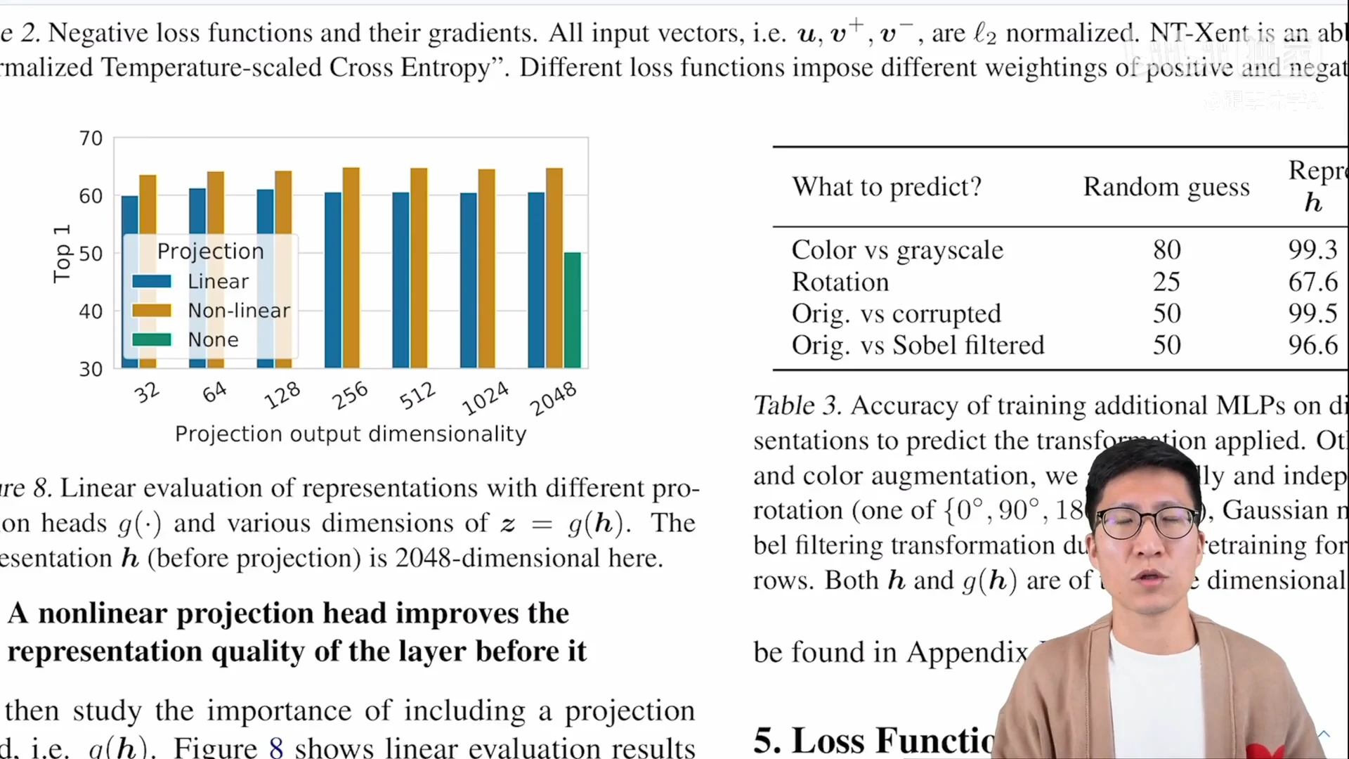 如图8所示,如果 h 是一个 res 50 出来的特征,也就是 2048 维的话,那z就是经过了 projector 之后的维度,一般是 128