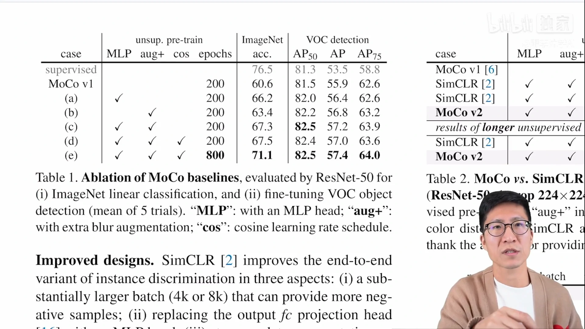 - 一个是它的改进真的是简单有效,而且有很大的影响力的,比如说它的动量编码器,在后面的 SimCLR、BYOL,一直到最新的对比学习的工作都还在使用。它提出的这个技术不仅在当时帮助 MoCo 第一次证明了无监督学习也能比有监督特征学习的预训练模型好,而且还能产生持续的影响力,帮助之后的工作取得更好的结果,所以它的改进很深刻而且很有效