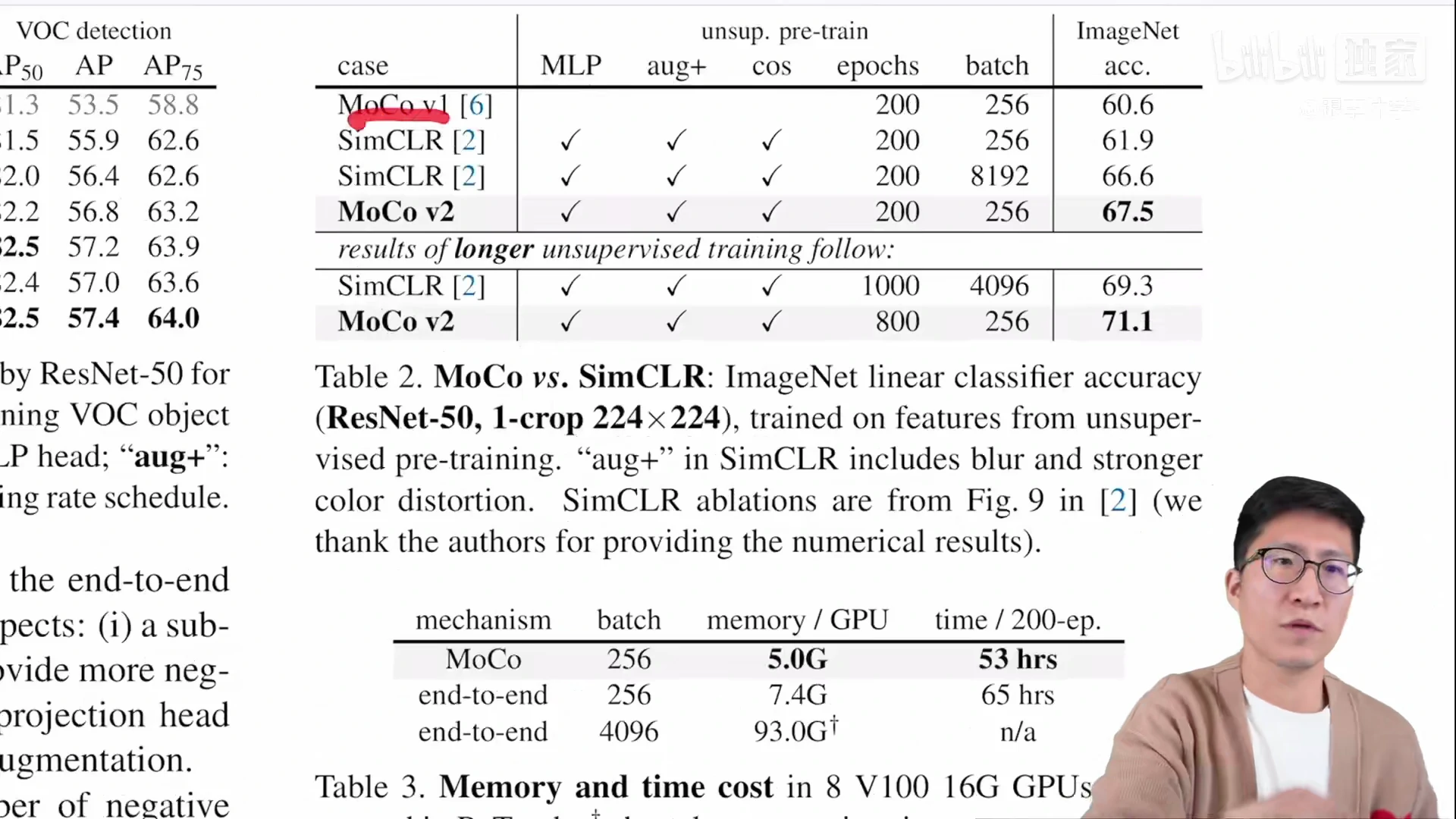 - 在只训练 200 epochs 的情况下,MoCo v2 比 SimCLR 高了大概一个点