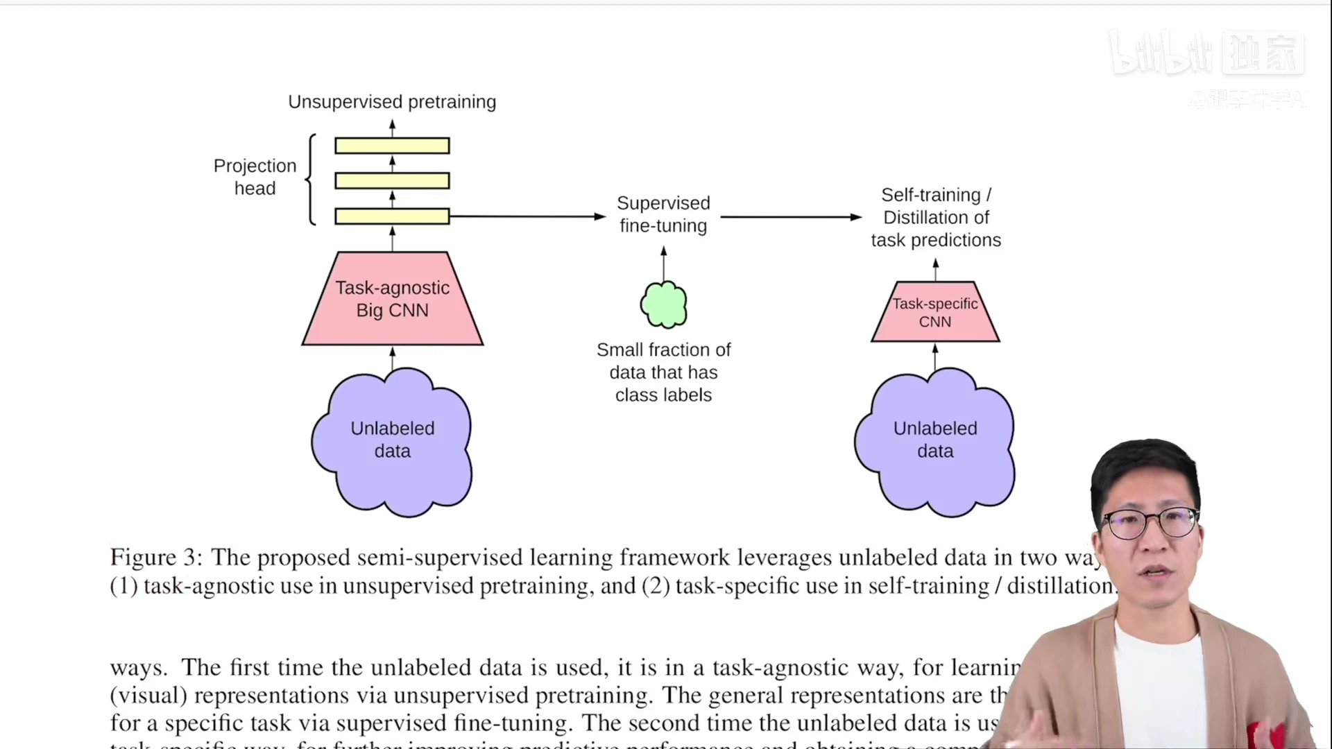 - 第二部分就是说,一旦有了这么好的一个模型,只需要一小部分有标签的数据,然后去做一下有监督的微调,一旦微调结束了,就相当于有一个 teacher 模型,就可以用这个 teacher 模型去生成很多伪标签,这样就可以在更多的无标签的数据上去做自学习了