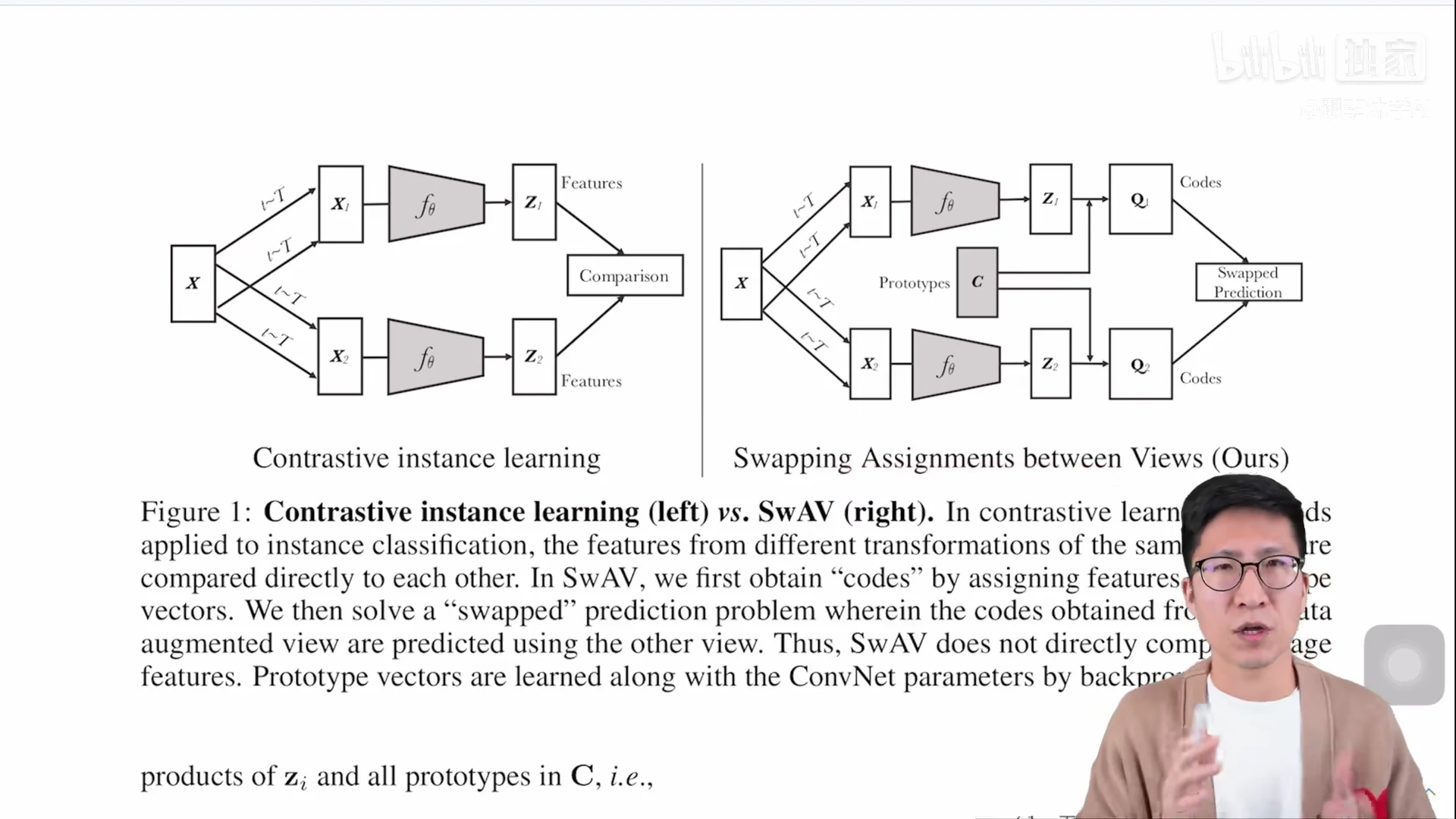 - 那如果两个特征非常相似,或者说含有等量的信息的时候,按道理来说应该是可以互相去做预测的,也就是说,如果拿 z1 这个特征去跟 c 去做点乘,按道理来说也是可以去预测 q2;反之亦然,z2 和这个 c 去做点乘也可以预测 q1,所以说点乘之后的结果就是预测,而 ground truth 就是之前按照 clustering 分类而得到的 q1 和 q2