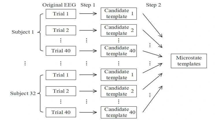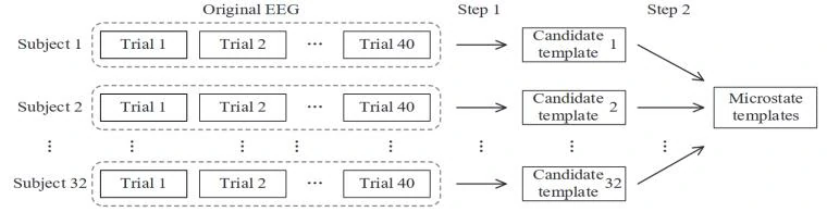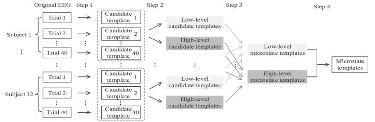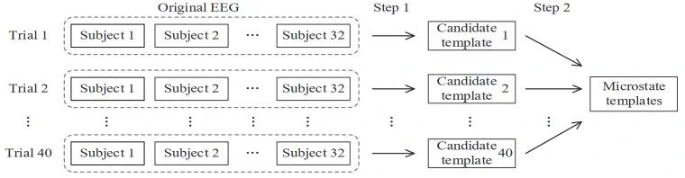 首先基于视频顺序重新排序所有EEG记录,然后在每个视频条件下,对32个被试的EEG记录进行拓扑聚类,提取出每个视频对应的候选模板。最后,对40个视频条件下提取出的所有候选模板进行拓扑聚类,得到视频泛化的微状态。