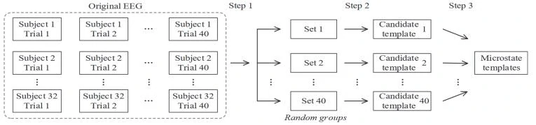 首先随机将1280次EEG记录分成40组,每组中记录来自不同的被试和试次。然后在每组内分别进行拓扑聚类,提取候选模板。最后,对40组中提取出的所有候选模板进行聚类,得到微状态。
