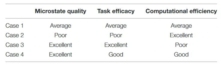 四种自下而上策略的比较如表1所示,在数据驱动的自下而上拓扑聚类策略中,基于单个trial的策略(Case 3)在微状态质量和任务效能方面表现最佳,但计算效率较低;基于随机分组的策略(Case 4)也具有可比的好性能,适用于高计算效率要求的应用。不同微状态检测方法与不同拓扑聚类策略的计算效率结果如表2所示。