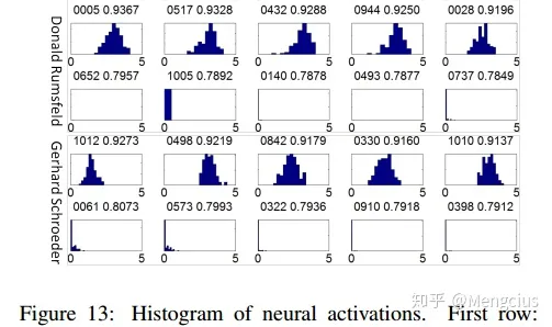 Fig.13是每个人的五个兴奋性神经元(偶数行)和五个抑制性神经元(奇数行)的直方图,显示了区分给定身份和剩余图像的最高二分类精度。