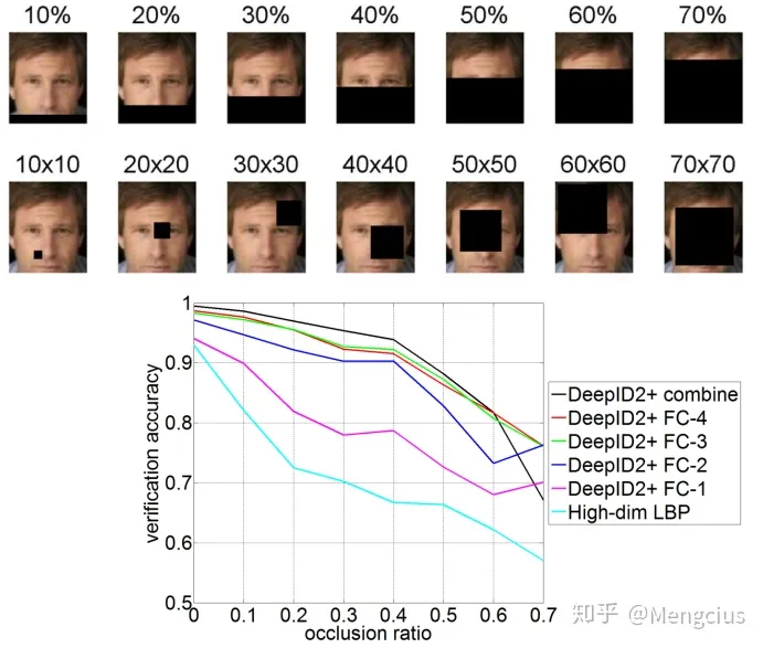 一般遮挡率越高,性能越低。用两种手工遮挡方式,对比其他方法,DeepID2+鲁棒性较好。当使用所有四个监督时最鲁棒。尽管特征是在没有人为遮挡的图像上训练的net上提取的,但是却自动地学习到了对遮挡鲁棒的特征。