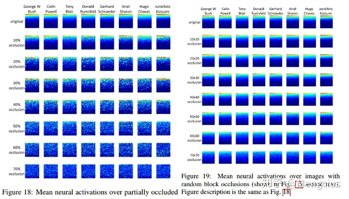 图18和19还给出了遮挡情况下每个神经元被激活的情况,对于两种类型的遮挡,激活模式基本保持不变,直到很大程度的遮挡。