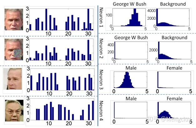 右:选取少数神经元对所有LFW人脸图像(作为背景)、所有属于Bush的图像、所有属性为男性的图像、所有属性为女性的图像进行神经元1~4激活直方图显示。