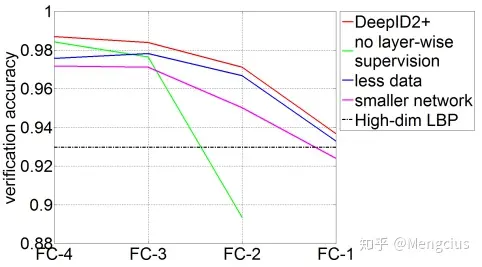 分别比较DeepID2+网络与没有逐层监督信号(layer-wise supervision)、较少的训练集、较少的feature map情况的性能,结果可知缺任何一项性能都会降低。