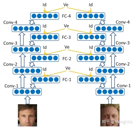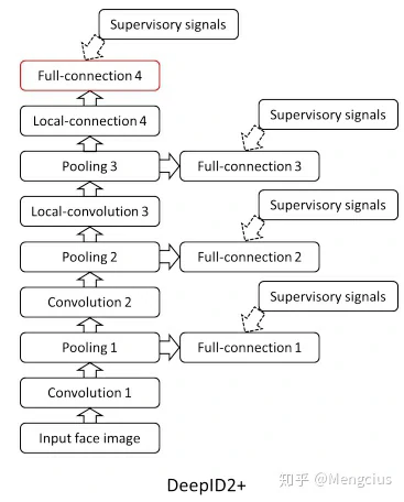 - 而在DeepID2网络中,监督信号仅被添加到连接到第3和第4卷积层的一个全连接层,而较低卷积层只能通过从较高层反向传播的梯度来监督。