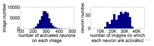 如直方图,左图计算了验证集中每张图被激活的神经元数在292个左右(共512个);右图计算了每个神经元被激活的图像数在26565张左右(共46594张)。
