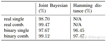 如表,在LFW上对原始的DeepID2+特征及其二值化表示进行了比较。real comb表示25个网络的原始FC-4层表示的精度,用联合贝叶斯作为相似性度量。后两行是二进制表示形式的精度,分别以联合贝叶斯和汉明距离作为相似性度量。