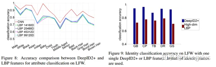 Fig.9:身份分类的准确性比较,单个DeepID2+和LBP特征比较,使用身份名称的首字母。