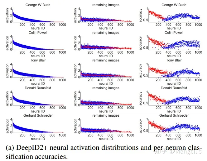 - 高层神经元对身份和身份相关属性具有高度选择性,比较敏感。可以识别不同的神经元子集,当存在不同的身份或属性时,这些子集总是被激发或总是被抑制。虽然DeepID2+没有被教导在训练期间区分属性,但它隐含地学习了这样的高级概念。