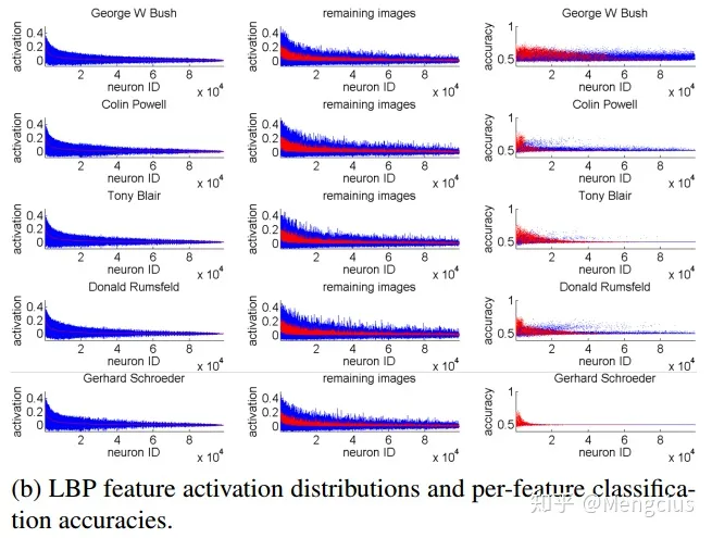 如下图为DeepID2+的神经元和LBP特征的激活情况,以及单个神经元(特征)的分类准确率。左列是对于单个身份的所有图像中神经元(特征)的激活情况的均值和标准差,均值由红线表示,标准差表示为由(均值-标准差)到(均值+标准差)的纵向小线段;中列是对于所有剩下图像的均值和标准差,与左列较为接近;右列是单个神经元(特征)的分类准确率,红点表示神经元处于激活状态,蓝点为抑制状态。