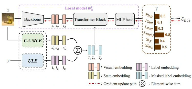 针对这一问题,本文提出了一种全新的联邦多标签分类框架 —— 联邦语言引导 Transformer(FedLGT)。该框架基于 Transformer 架构,通过两大核心技术突破现有瓶颈:一是客户端感知掩码标签嵌入(Client-Aware Masked Label Embedding, CA-MLE),引导局部模型聚焦全局模型尚未掌握的标签知识;二是通用标签嵌入(Universal Label Embedding, ULE),利用预训练视觉 - 语言模型(如 CLIP)的文本编码器生成统一标签嵌入,实现跨客户端标签语义对齐。