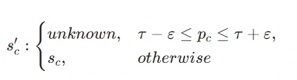 其中,τ= 0.5为判断阈值,ε= 0.02为不确定性边际,ρc为全局模型对标签c的预测概率。