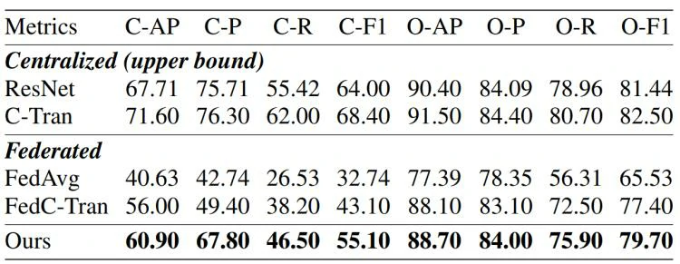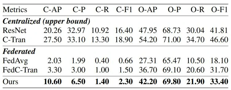 如下表1所示,在 FLAIR 粗粒度任务中,FedLGT 的性能全面领先现有方法:其 C-AP 达到 60.90,较 FedC-Tran(56.00)提升 4.9 个百分点,C-F1 为 55.10,较 FedC-Tran(43.10)提升 12 个百分点;与 FedAvg 相比,优势更为显著,C-AP 提升近 20 个百分点。即使与集中式模型相比,FedLGT 的性能衰减幅度也最小,例如 C-AP 仅比集中式 C-Tran 低 10.7%,而 FedC-Tran 则低 15.6%,充分证明其对标签关联的建模能力更优。