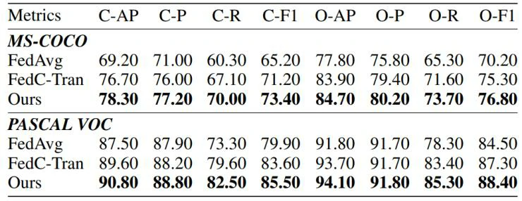 如下表3所示,在 MS-COCO 与 PASCAL VOC 数据集上,FedLGT 同样表现优异。MS-COCO 上,其 O-F1 达 76.80,较 FedC-Tran(75.30)提升 1.5 个百分点;PASCAL VOC 上,C-F1 为 85.50,超越 FedC-Tran(83.60)1.9 个百分点,证明其泛化能力不受数据集特性限制,在传统多标签场景中依然有效。