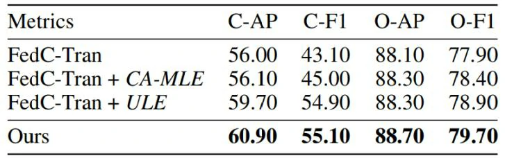 如下表4所示,消融实验进一步验证了各核心组件的有效性:仅添加 ULE 时,FedC-Tran 的 C-AP 从 56.00 提升至 59.70(+3.7 个百分点),证明统一标签语义空间的重要性;仅添加 CA-MLE 时,C-AP 仅提升 0.1 个百分点,但与 ULE 结合后,C-AP 可进一步提升至 60.90(+1.2 个百分点),体现了组件间的协同价值。