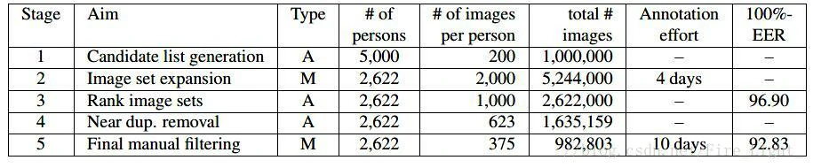 - 从零开始构建一个人脸识别数据库,一共 2.6M images, over 2.6K people,构建过 程主要是程序实现的,少量人工参与。