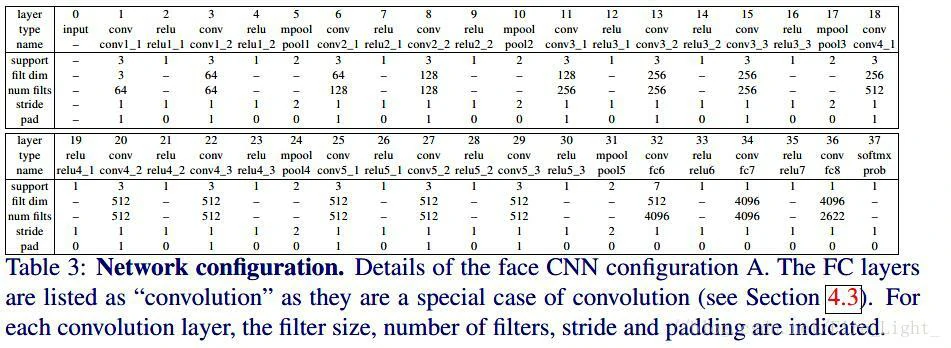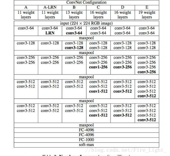 看图片的描述,作者说这是VGGNet中的A结构,但是参考VGGNet论文中的结构表(如下),博主认为却是D结构,不知道是不是作者写错了,但是影响不大。