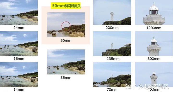 知道了标准焦距之后,其余焦距又会带来怎么样的视角呢?下图是带风整理出来的各焦距视角,建议大家可以仔细观察图中红色圆圈处灯塔,看它在不同焦距下所呈现出来的视角;并观察图片下半部的海面,借此观察整个照片的宽广程度有何变化。
