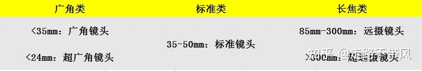 而从上图我们可以看出,一般镜头的焦距大概可以归纳成下面几类: