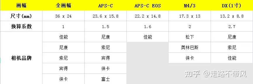 上述提到的焦距都是指全画幅相机的焦距,由于APS-C、DX(1寸)和M43的视角和全画幅不同,因此在广角、标准和长焦镜头的定义上自然也不太一样,带风也特地将APS-C、DX(1寸)和M43的相对焦距换算系数放在下面,如果你的相机是APS-C或其它画幅相机,记得将焦距换成等效焦距后才能比较。