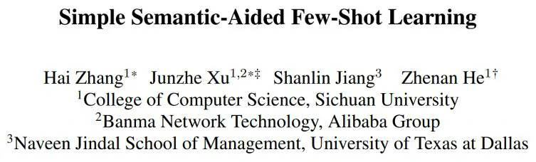 该论文发表于2024 IEEE/CVF Conference on Computer Vision and Pattern Recognition (CVPR)(CCF A类),题目为《Simple Semantic-Aided Few-Shot Learning》。